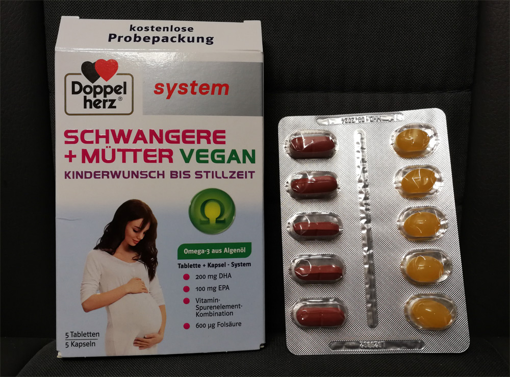 Darin befand sich eine Packung Doppelherz Schwangere + Mutter Vegan mit 5 Tabletten – ein Nahrungsergänzungsmittel mit unter anderem Folsäure, das speziell für Schwangere und junge Mütter entwickelt wurde.