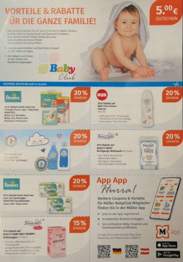 Unter den deutschen Drogerien ist Müller besonders, da ein Teil der Baby-Willkommensgeschenke per Post verschickt wird, inklusive eines Codes zur Abholung eines Baby-Geschenkpakets in der Filiale.