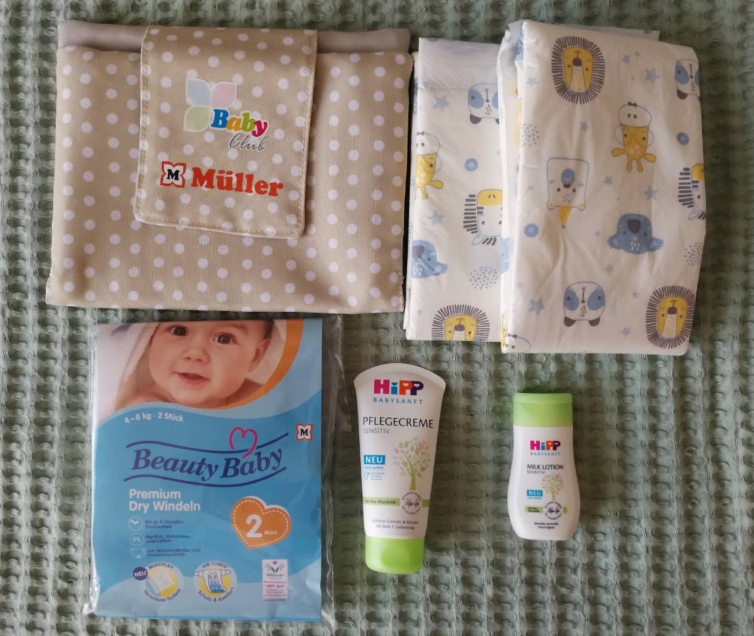 Zusammen mit den Gutscheinen habe ich das Müller Baby-Willkommenspaket erhalten. Darin waren unter anderem zwei Einweg-Wickelunterlagen, die sich als sehr nützlich erwiesen haben.